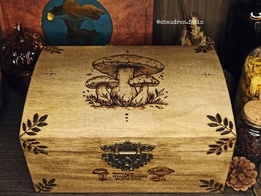 À travers mes dioramas miniatures, mes coffrets runiques ou mes pyrogravures, je donne vie à un univers où se mêlent la sorcellerie verte, mythes nordiques, poésie fantastique et bouts de nature figés dans le temps, immortels.