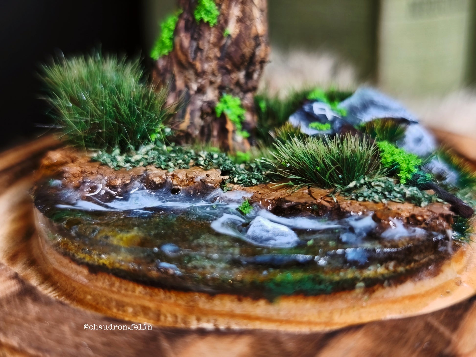 - Hache construite avec de la résine et un cure-dent, tronc sculpté avec de l'argile auto-durcissante, pierre avec du polystyrène extrudé.